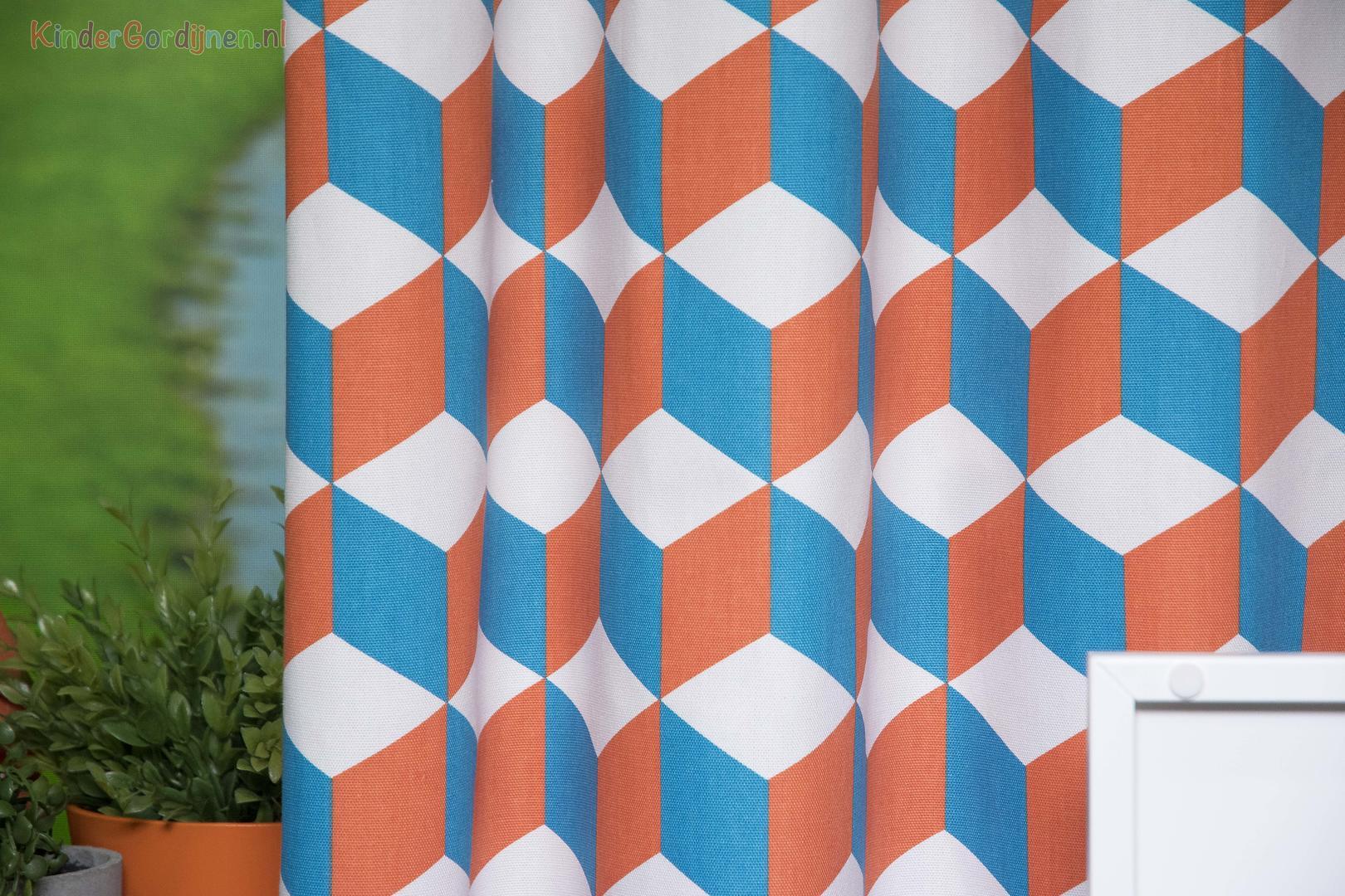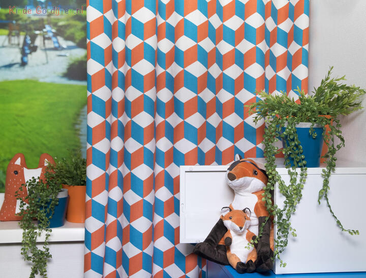 Cube Kindergordijn, dat is de naam van dit mooie gordijn. Het is een kindergordijn met allemaal vierkantjes (cubes) en het lijkt in de eeuwigheid door te gaan. Door de mooie kleuren van oranje en blauw en het rustige wit komt het kindergordijn helemaal tot leven. Het kindergordijn is gemaakt van 100% katoen hierdoor is het heerlijk soepel en zacht en kan je ook dit kindergordijn laten verduisteren zodat je in één keer klaar bent met het gordijn. Je kind kan nu heerlijk slapen in een donkere kamer. Maar als je het kindergordijn eerst wil zien en voelen dan bestel je een knipstaal en dan kun je het met eigen ogen zien. Dit is een tip van Jelmer! Hou jij ook zo van die wiskundige figuren?