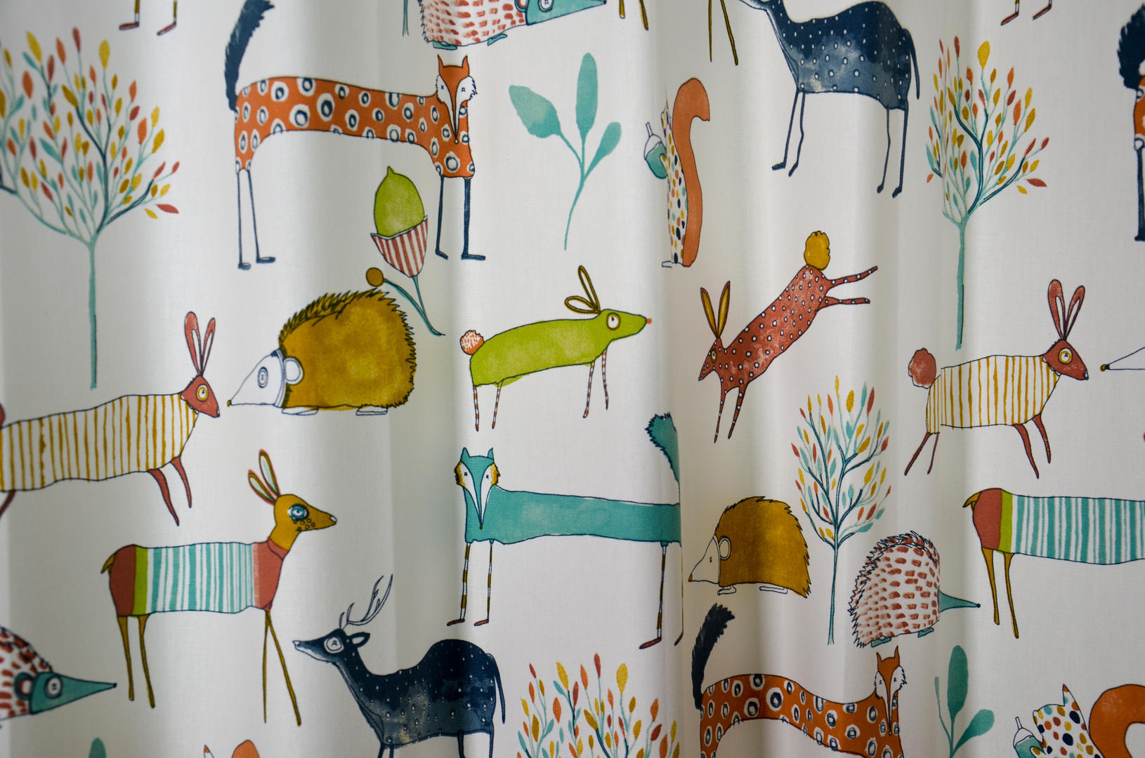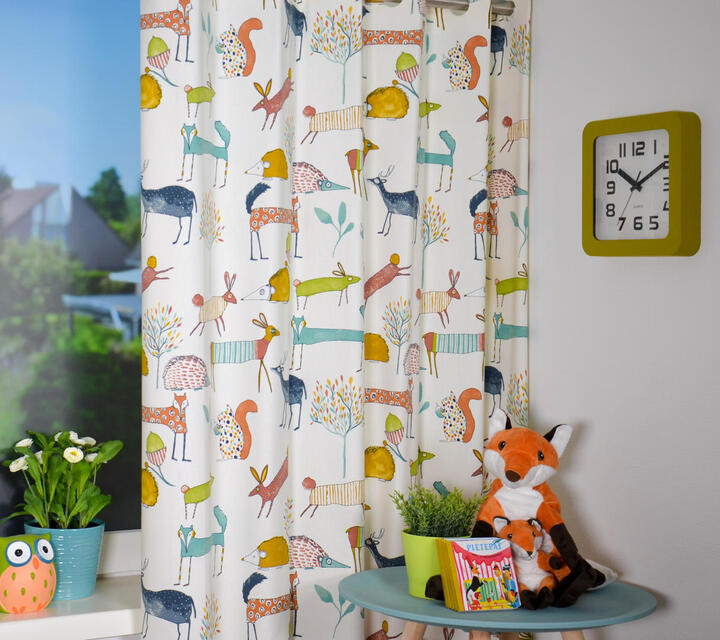 Fraai gordijn voor de meisjes- en jongensslaapkamer. Kunstzinnig getekende bosdieren komen gezellig bij je ‘buurten’ en maken de kamer direct gezellig & sfeervol. De afbeeldingen zijn gedrukt op dicht geweven, matte katoen. De ondergrondkleur is warm wit en de stof leverbaar in 3 verschillende kleuren. Houd je van schattig, maar niet al te zoetsappig, dan is dit gordijn perfect! Voor extra verduistering even voeren aanvinken in het bestelproces.
