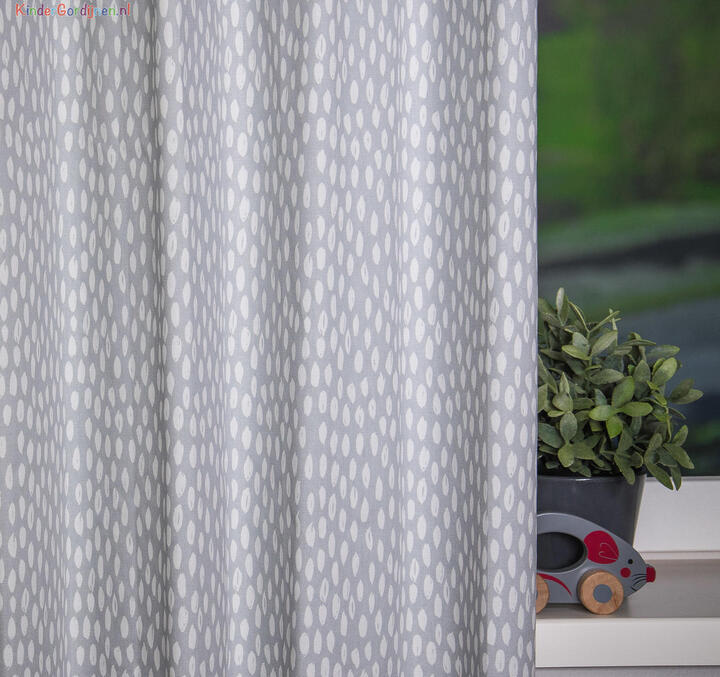 "Zachtjes tikt de regen..." De subtiele druppeltjes print op dit katoenen gordijn geeft de kinderkamer een rustgevende sfeer. Decoratief, maar toch tijdloos. Het gordijn is leverbaar in acht verschillende kleuren en daardoor geschikt voor de babykamer, meisjeskamer of jongenskamer. Het is mogelijk om verduisterende voering toe te voegen om de kamer donker te maken. Dit zorgt meteen voor extra bescherming en isolatie.