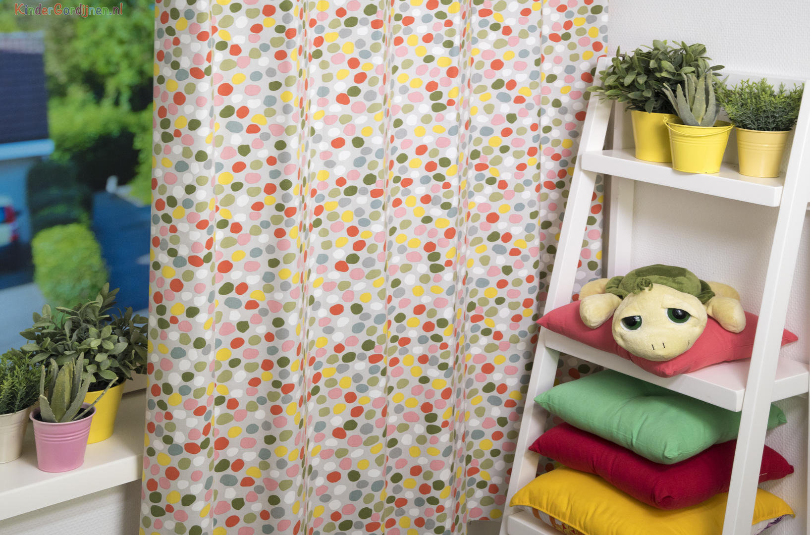 STIPPEN zijn HIP! En dit gordijn heeft er heel wat in héérlijke heldere, frisse kleuren. De stip is 3 cm in doorsnede en heeft het effect alsof zij met de kwast aangebracht zijn. Dat geeft een speels en kleurrijk effect. De ondergrond is een warm witte, dicht geweven stof, die desgewenst verduisterend gevoerd kan worden. Je kunt dit gordijn heel leuk combineren met een pittige muurverfkleur.