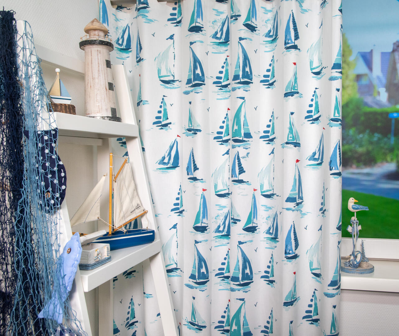 Een fraai maritiem gordijn, leverbaar in 3 kleuren. De lekker robuust geweven stof is warm wit van kleur en aan de voorzijde bedrukt met schilderachtige zeilbootjes. De blauwe en grijze variant heeft diep steenrood als accentkleur. De zeilbootjes zijn +/- 15 cm groot. Het is natuurlijk super leuk om dit thema met accessoires uit te breiden en evt. een accent blauwe of groene wand. De kwalitatief hoogwaardige stof valt soepel en kan desgewenst nog gevoerd worden. Zie jij de nieuwe kamer al voor je?
