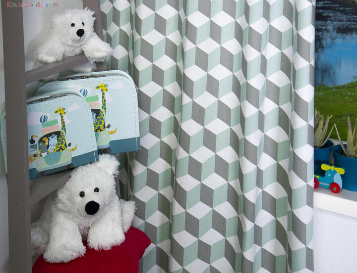 Cube Kindergordijn, dat is de naam van dit mooie gordijn. Het is een kindergordijn met allemaal vierkantjes (cubes) en het lijkt in de eeuwigheid door te gaan. Door de mooie kleuren van oranje en blauw en het rustige wit komt het kindergordijn helemaal tot leven. Het kindergordijn is gemaakt van 100% katoen hierdoor is het heerlijk soepel en zacht en kan je ook dit kindergordijn laten verduisteren zodat je in één keer klaar bent met het gordijn. Je kind kan nu heerlijk slapen in een donkere kamer. Maar als je het kindergordijn eerst wil zien en voelen dan bestel je een knipstaal en dan kun je het met eigen ogen zien. Dit is een tip van Jelmer! Hou jij ook zo van die wiskundige figuren?
