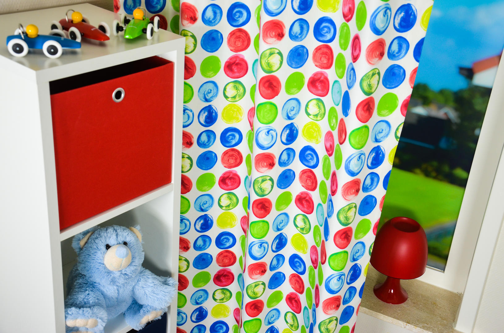 Vrolijke verfstippen op een warm witte ondergrond. Is het abstracte kunst of juist het schilderspalet? Beide stralen zonneschijn en creativiteit uit. De cirkels zijn 6 cm in doorsnede en het gordijn is leverbaar in 4 heldere kleurcombinaties. De stof is dicht geweven, voor verduistering evt. extra laten voeren. Alle kleurcombinaties zijn sprankelend en nodigen uit tot expressie.