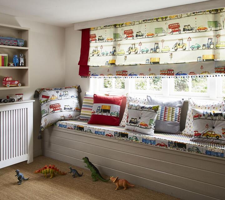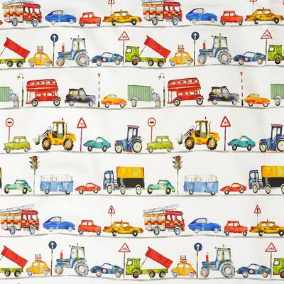 Een file was nog nooit zo leuk! Dit kindergordijn met auto’s, tractoren en vrachtwagens in vrolijke kleuren, maakt van iedere jongenskamer een gezellige plek. De grote verticale banen van ongeveer 20 cm, zorgen ervoor dat de print niet te druk wordt. Door de grote variatie aan voertuigen verveelt dit gordijn nooit! Je kunt kiezen voor een stoere lichtgrijze/off-white achtergrond, of voor een neutrale witte achtergrond. De gordijnstof is van 100% katoen en kan indien gewenst verduisterend worden geleverd.