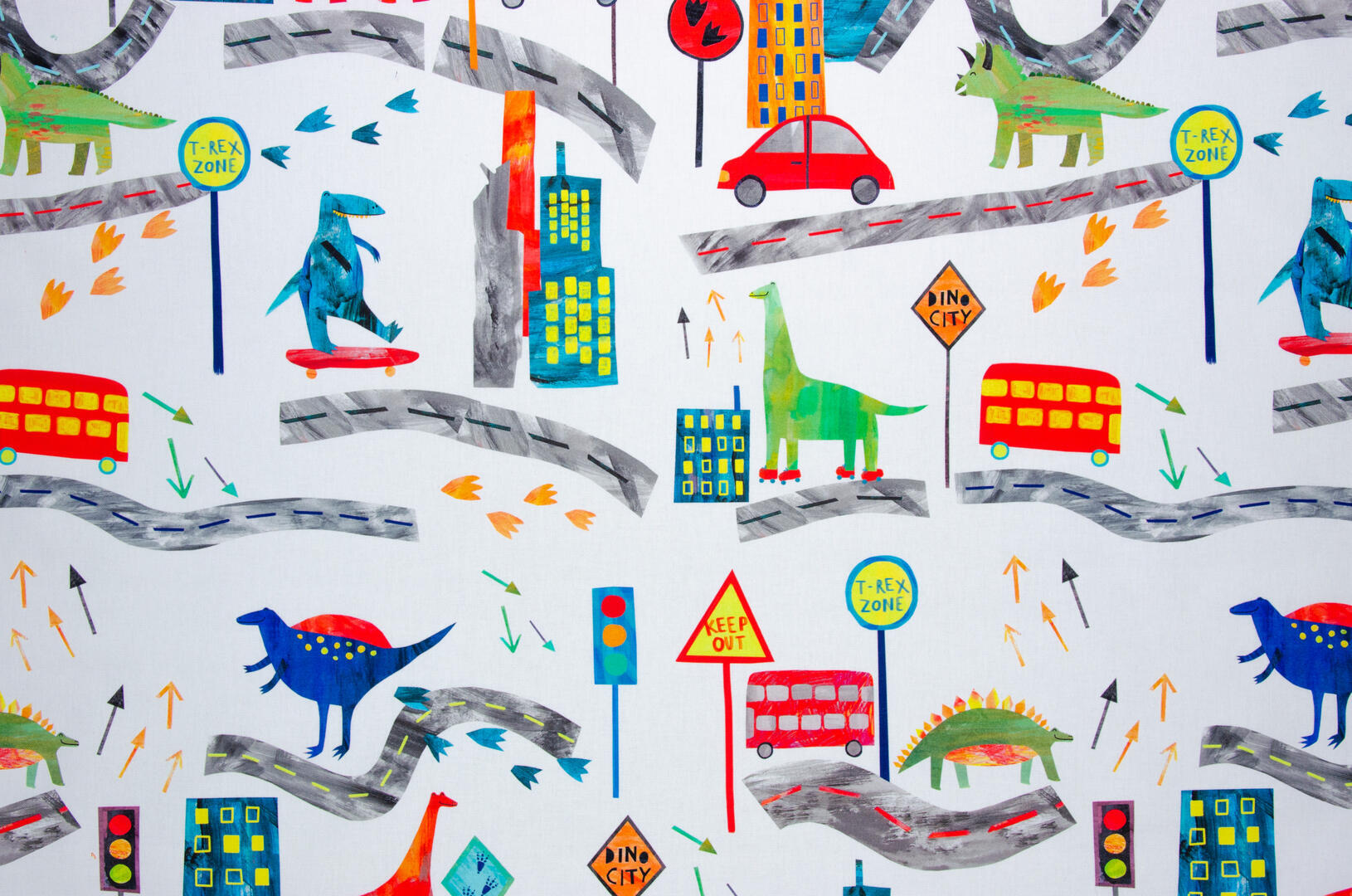 Dat geldt zeker ook voor deze gordijnstof met de naam Dino City, een unieke gordijnstof met een dessin.