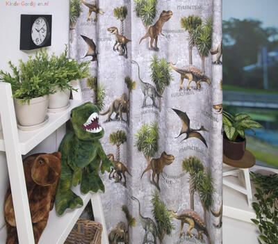 Dat geldt zeker ook voor deze gordijnstof met de naam RaptorRex, een unieke gordijnstof met een dino's dessin.