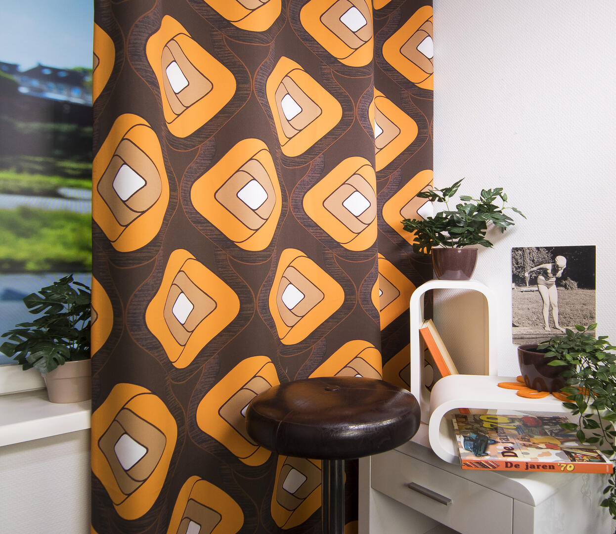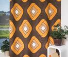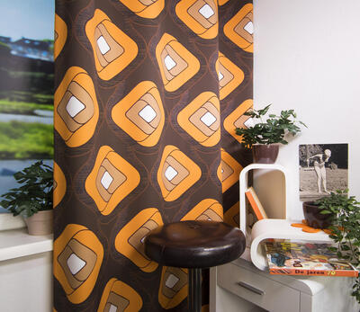 Zeer soepele fijn geweven gordijnstof met grafisch retro dessin op voorzijde van de stof.