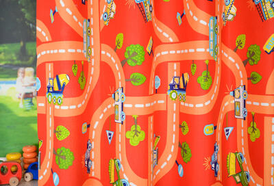 Dat is leuk! Een autoroute op je gordijn! Van brandweerauto tot cementwagen rijdt er op de weg. Jij mag in jouw slaapkamer de route bepalen. De auto’s zijn +/- 10 x 8 cm en de stof leverbaar in 2 frisse, eigentijdse kleuren. Door het royale patroon kan dit gordijn uitstekend voor grotere raamoppervlaktes. Tevens kamerhoog, waardoor je voor hetzelfde geld de stof tot de grond geconfectioneerd krijgt. Welke jonge vent wordt hier nu niet blij van? Voor verduistering even laten voeren.