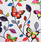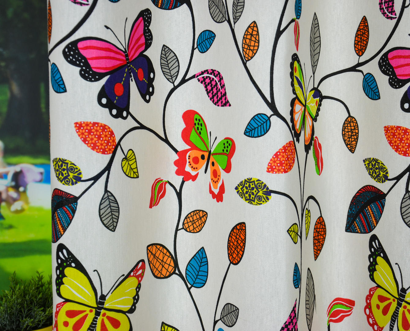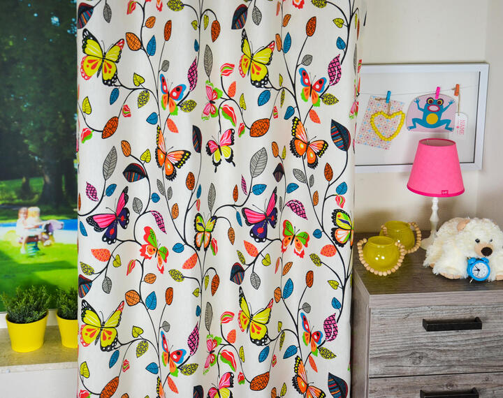 Vrolijke vlindergordijnen voor jouw slaapkamerraam! De afbeeldingen zijn gedrukt op sportieve, ietwat geribde stof. De ondergrondkleur is warm roomwit en het gordijn leverbaar in 2 verschillende kleurpaletten. Frisse zomerse tinten en de ander een wat ‘volwassener’ kleurgebruik. Ook goed te combineren met gebloemd behang. Welke past het beste bij jouw kamer? De stof is kamerhoog, dus voor hetzelfde geld mooi tot de grond geconfectioneerd! Voor een verduisterend effect graag laten voeren.