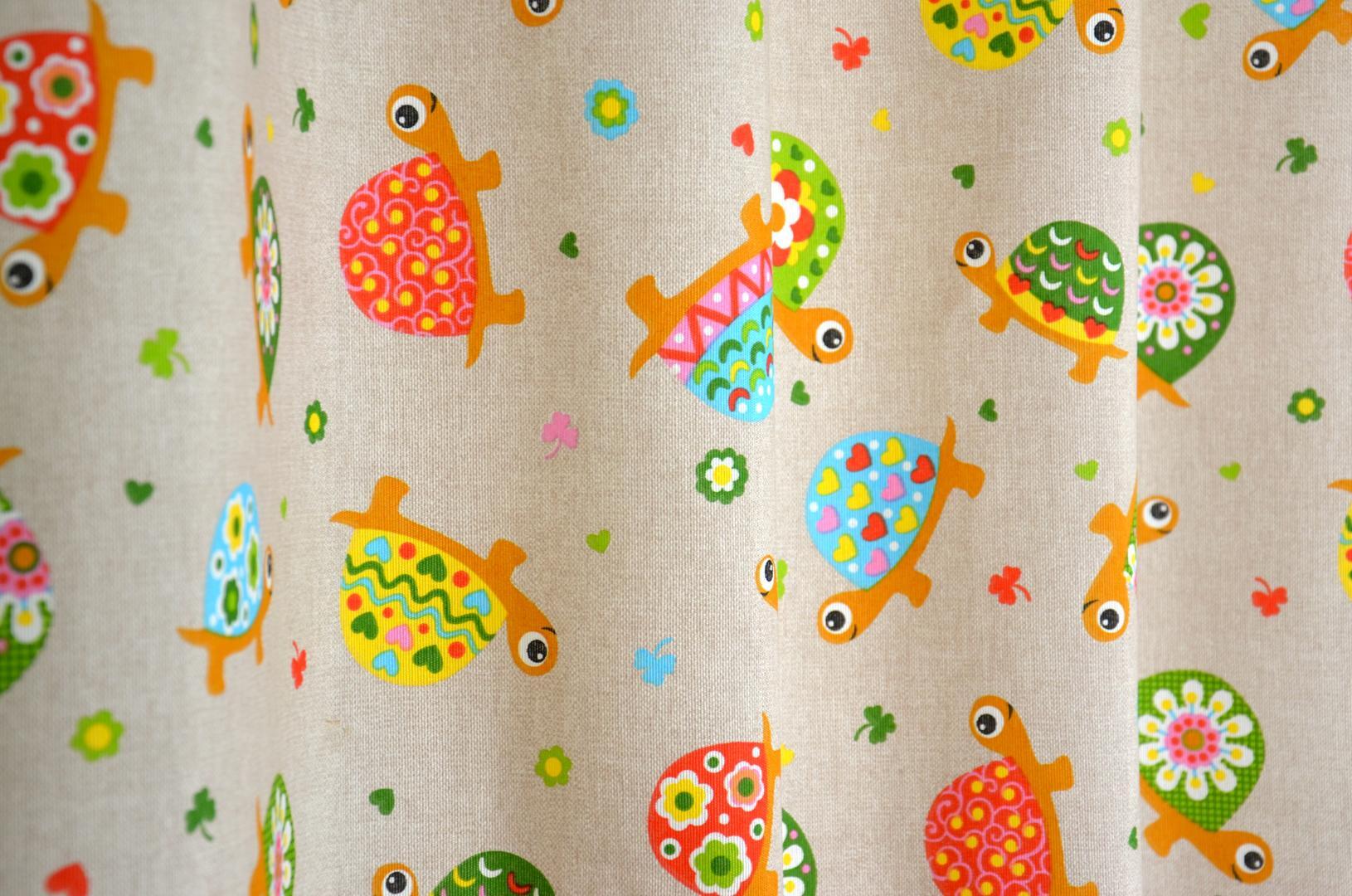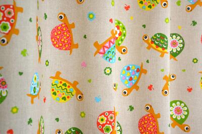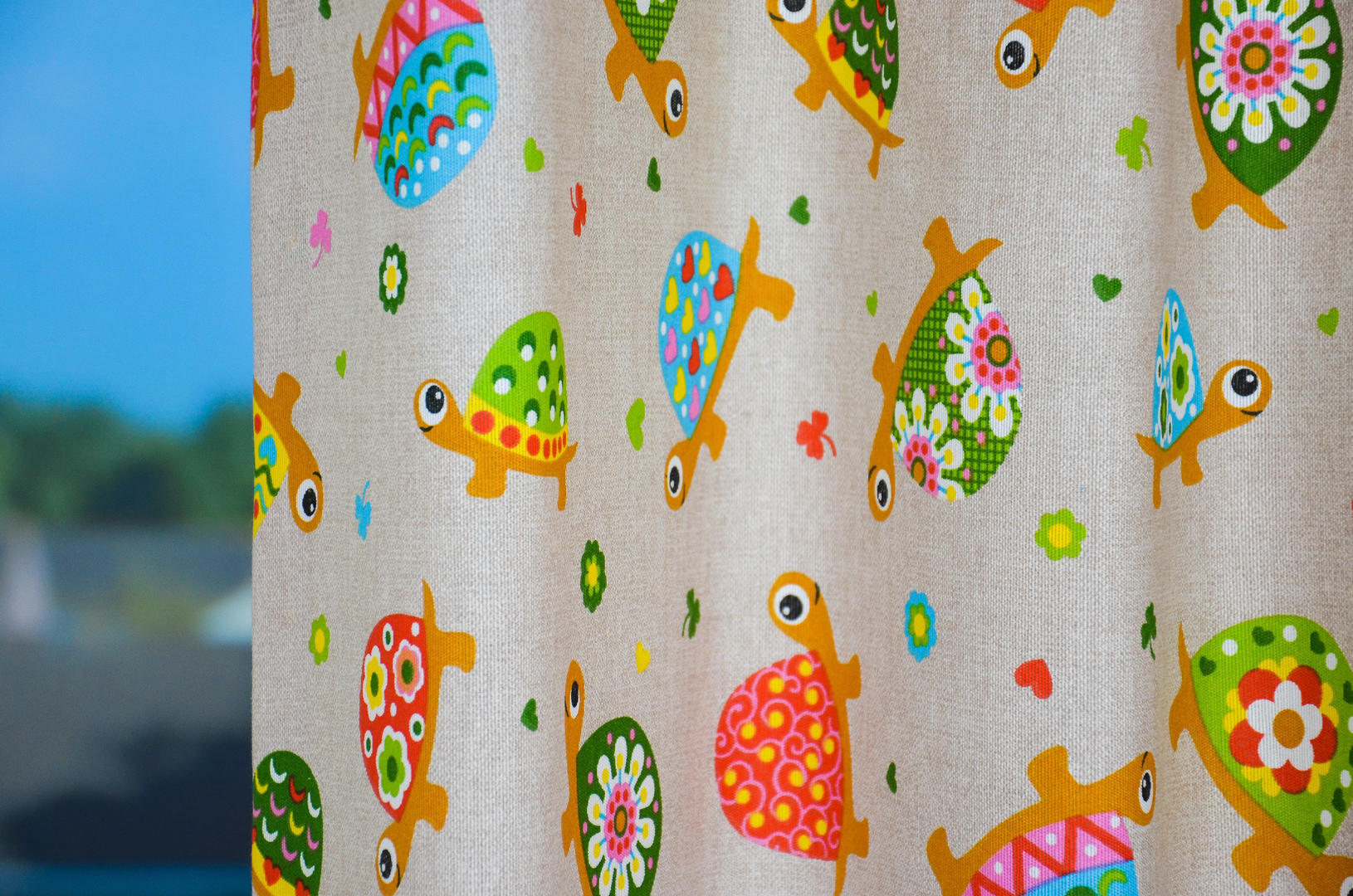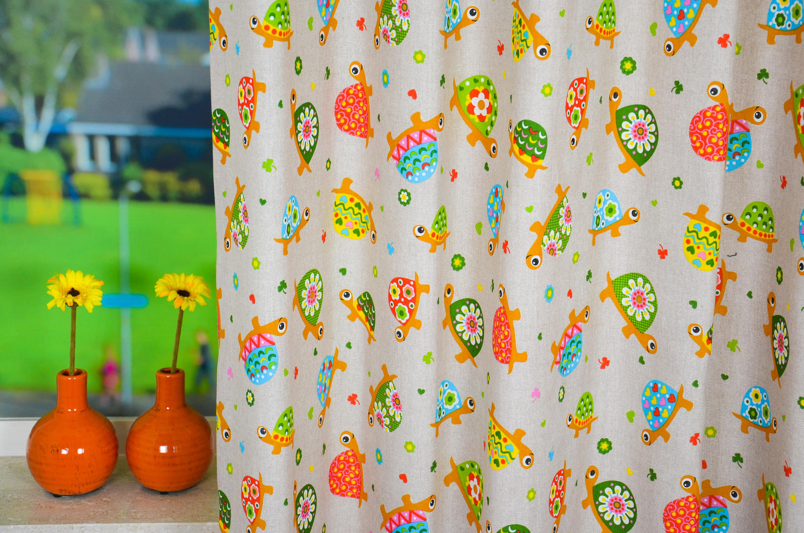 Dit decoratieve gordijn moet je eigenlijk in het écht zien! De vrolijk en kleurrijke schildpadjes zijn gedrukt op licht geribbelde stof. De stof is leverbaar in 2 verschillende warme ondergrondkleuren: linnen of nostalgisch bruin. Dat geeft extra gezelligheid aan de slaapkamer. De schildpadjes zijn 7 x 10 cm en kijken allemaal blij jouw kamer in. Riet & rotan past perfect bij dit sfeertje. Desgewenst verduisterend voeren.