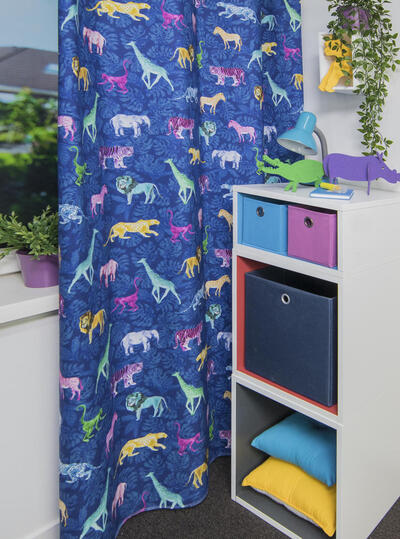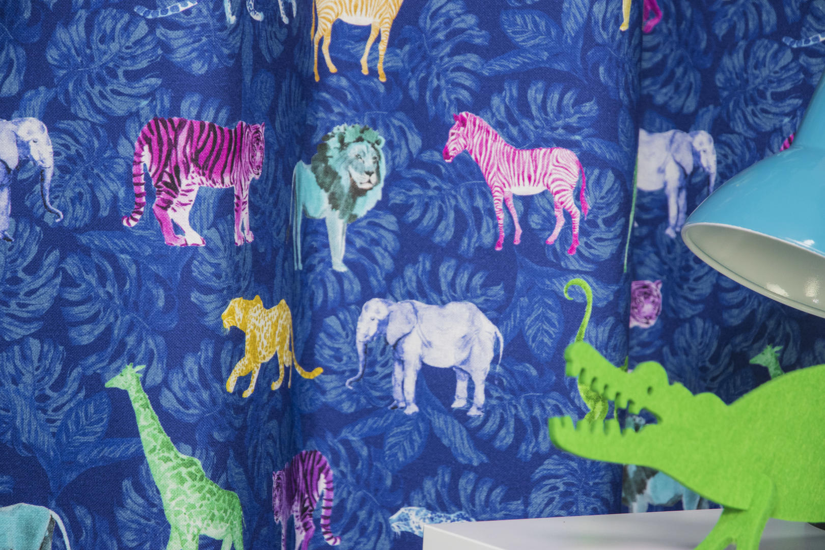 Dat geldt zeker ook voor deze gordijnstof met de naam Safari Blue, een unieke gordijnstof met een jungle en safari dessin.