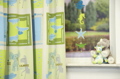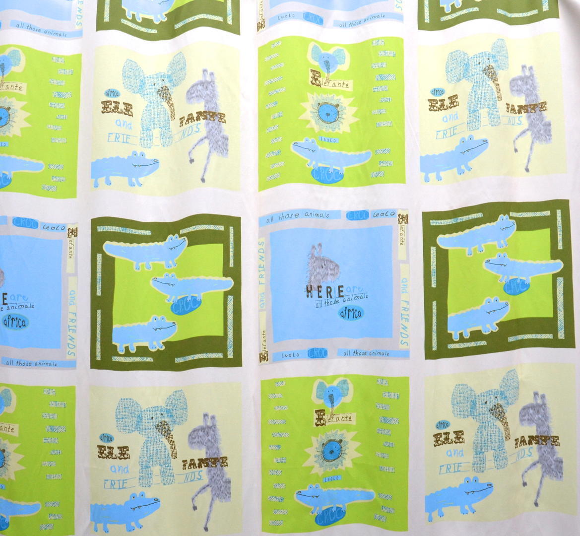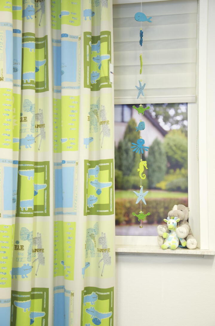 De Safari is een verduisterend gordijn voor de kinderkamer met rustgevende groen- en blauwtinten. Het voordeel van verduisterende gordijnen is niet alleen de zonwerende functie, ze hebben ook nog eens een isolerende werking.