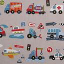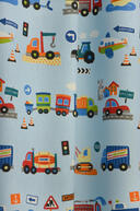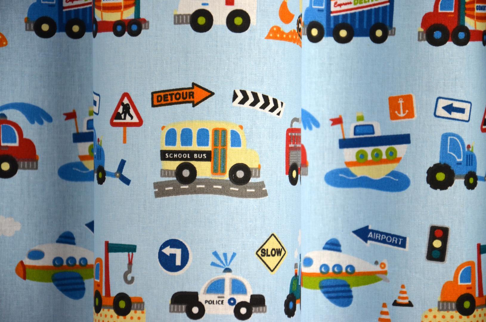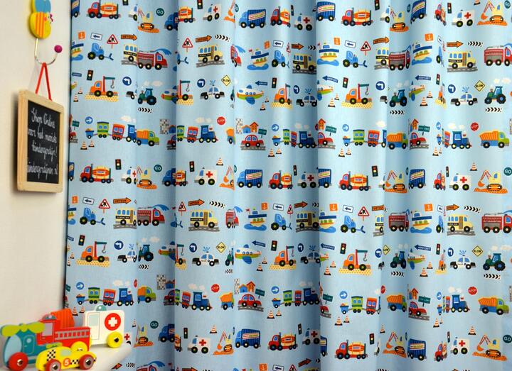 Auto, trein en boot, al reizend word je blij & groot. Héérlijk gordijn voor ondernemende kids! Het extra leuke van dit kindergordijn is dat er zoveel op te zien is. De verschillende auto’s, treinen, bootjes zijn gedrukt op soepelvallende, matte katoen. Deze is glad geweven en leverbaar in 2 verschillende ondergrond kleuren: fris zachtblauw of taupegrijs. Bij de zachtblauwe variant is een lichtgrijs geverfde wand leuk. Bij de taupe grijze ondergrond kleurt een blauwe muur leuker. Dat is ideaal, want zo kan je precies jouw gewenste kleurcombinatie bepalen. Stap gezellig in en maak een fijne reis naar dromenland in jouw favoriete voertuig!