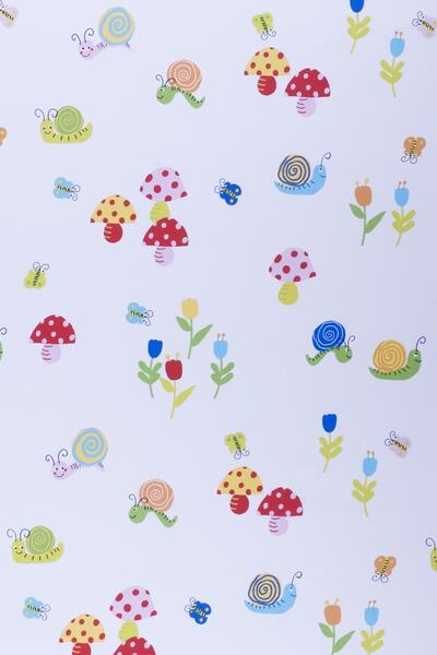 Kleurrijk kindergordijn met schattige illustraties van slakken, paddestoelen en vlinders. U kunt de gordijnstof door ons laten voeren tot een verduisterend gordijn. Vink deze optie aan in het bestelproces.