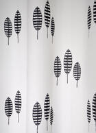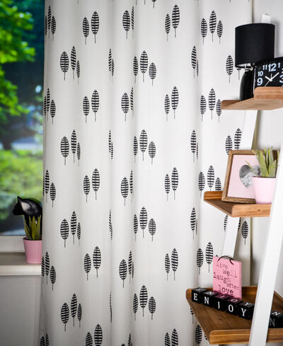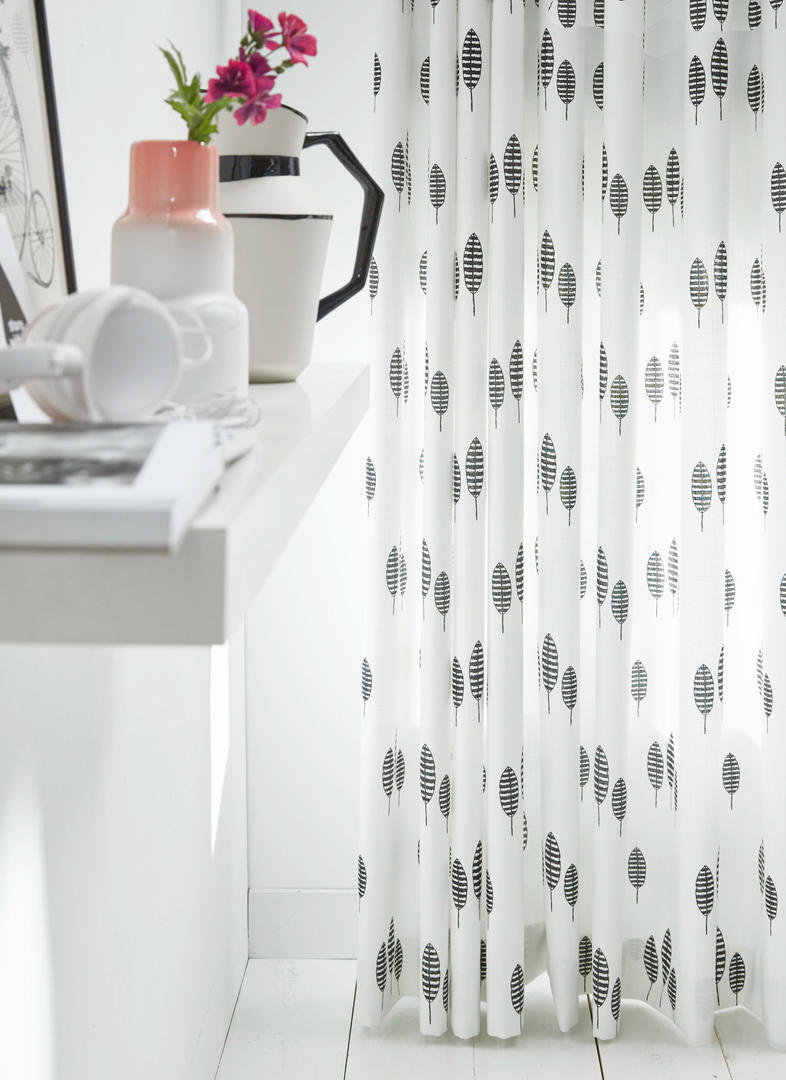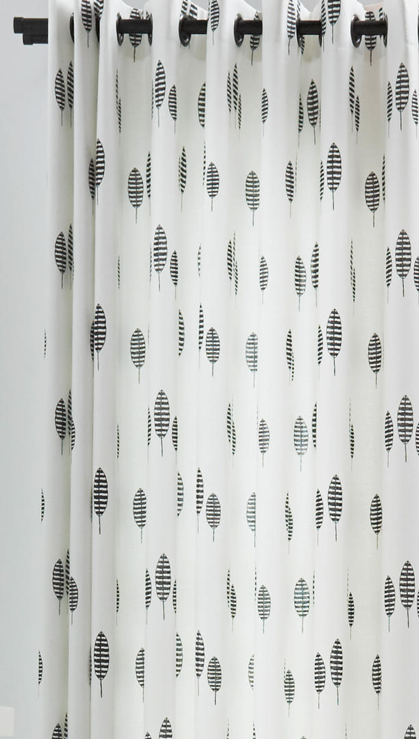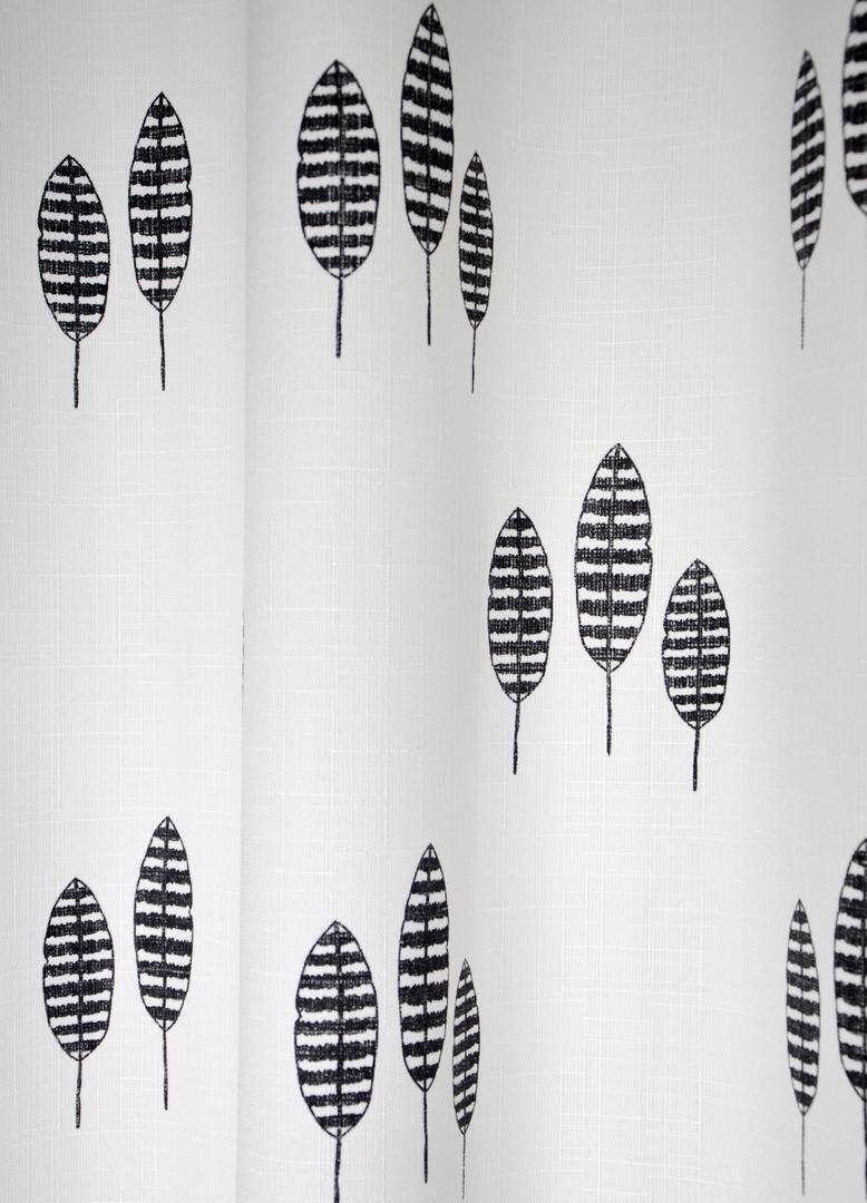 Zeer soepel vallende gordijnstof met een eenvoudig gestileerd zwart bladmotief. De gordijnstof heeft een natuurlijke uitstraling van linnen door het gebruik van onregelmatige garens. De print is aan de achterzijde licht zichtbaar.