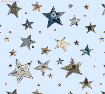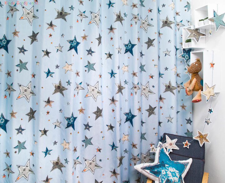 Een súper speciaal sterrengordijn voor de kinderkamer, ontworpen door Hanneke de Jager. Deze beeldend kunstenares is schrijver en tevens illustrator van een aantal bijzonder leuke kinderboeken. Zij omschrijft haar stijl als: “Fris, kleurrijk, levendig, speels en zonnig.” Door gebruik van verschillende materialen zoals stofjes van de markt, knopen en gebreide truien, geeft zij haar illustraties iets unieks. In het patroon zie je namelijk de weergave van die leuke details van de verschillende texturen. Het stylen van de kinderkamer is geweldig leuk om te doen en hoe bijzonder is het om een gordijn van een échte ontwerpster te hebben! Dit gordijn is gedrukt op vergrijsd blauwe, matte en soepel vallende stof. De print is aan de voorzijde gedrukt en als je goed kijkt zie je die kenmerkende ‘Hanneke’ details. Een fijn weergeven stiksel, een opgestikt knoopje en bijna aaibaar stukje schipperstrui. Wil je ook nog lekker donker slapen onder deze sprankelende sterrenhemel, dan kan het gordijn verduisterend gevoerd worden. Kortom, wil jou lieve vent of meisje op een bijzondere manier naar dromenland? Geef je eigen stralende topper dan een fantasierijk Hanneke de Jager gordijn!