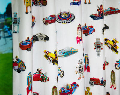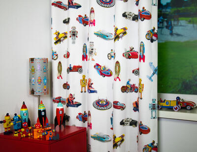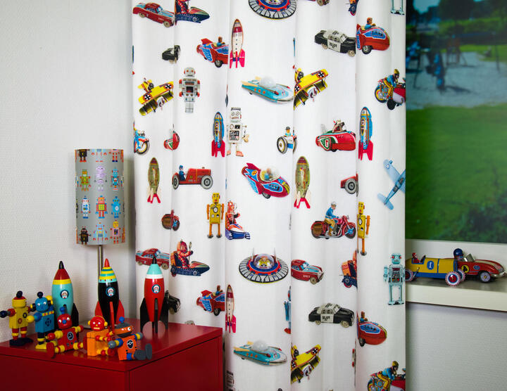 Dat geldt zeker ook voor deze gordijnstof met de naam Tin Toys, een unieke gordijnstof met een transport dessin.