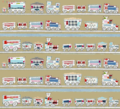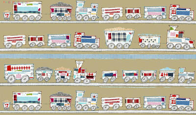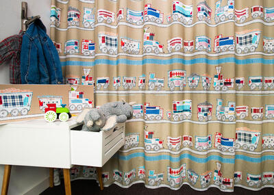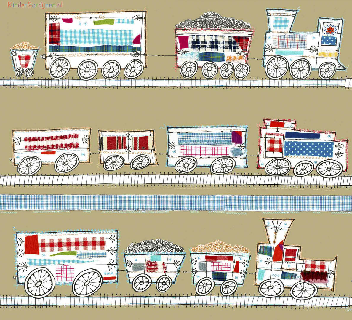 Een origineel treingordijn voor de kinderkamer, ontworpen door Hanneke de Jager. Deze beeldend kunstenares is schrijver en tevens illustrator van een aantal bijzonder leuke kinderboeken. Zij omschrijft haar stijl als: “Fris, kleurrijk, levendig, speels en zonnig.” Door gebruik van verschillende materialen zoals stofjes van de markt, knopen en gebreide truien, geeft zij haar illustraties iets unieks. In het patroon zie je namelijk de weergave van die leuke details. Zo is de locomotief voorzien van leuke patchwork stofjes en zig-zag steekjes rondom. Het stylen van de kinderkamer is geweldig leuk om te doen en hoe bijzonder is het om een gordijn van een échte ontwerpster te hebben! Dit kindergordijn is gedrukt op een diepe zandkleurige (haast fraai licht olijfgroene) soepel vallende stof. De print is op de voorzijde gedrukt en als je goed kijkt zie je die kenmerkende ‘Hanneke’ details. Doordat de treintjes horizontaal herhalend over het getekende spoor rijden, is dit een rustig en toch heel vrolijk gordijn. De goederenwagons zijn zo’n 13 x 10 cm groot (b x h) en haast voelbaar echt gedecoreerd met wol, lapjes en steekjes. Mag jouw eigen lieveling op een bijzondere manier naar dromenland? Geef je eigen topper dan een fantasierijk Hanneke de Jager kindergordijn!