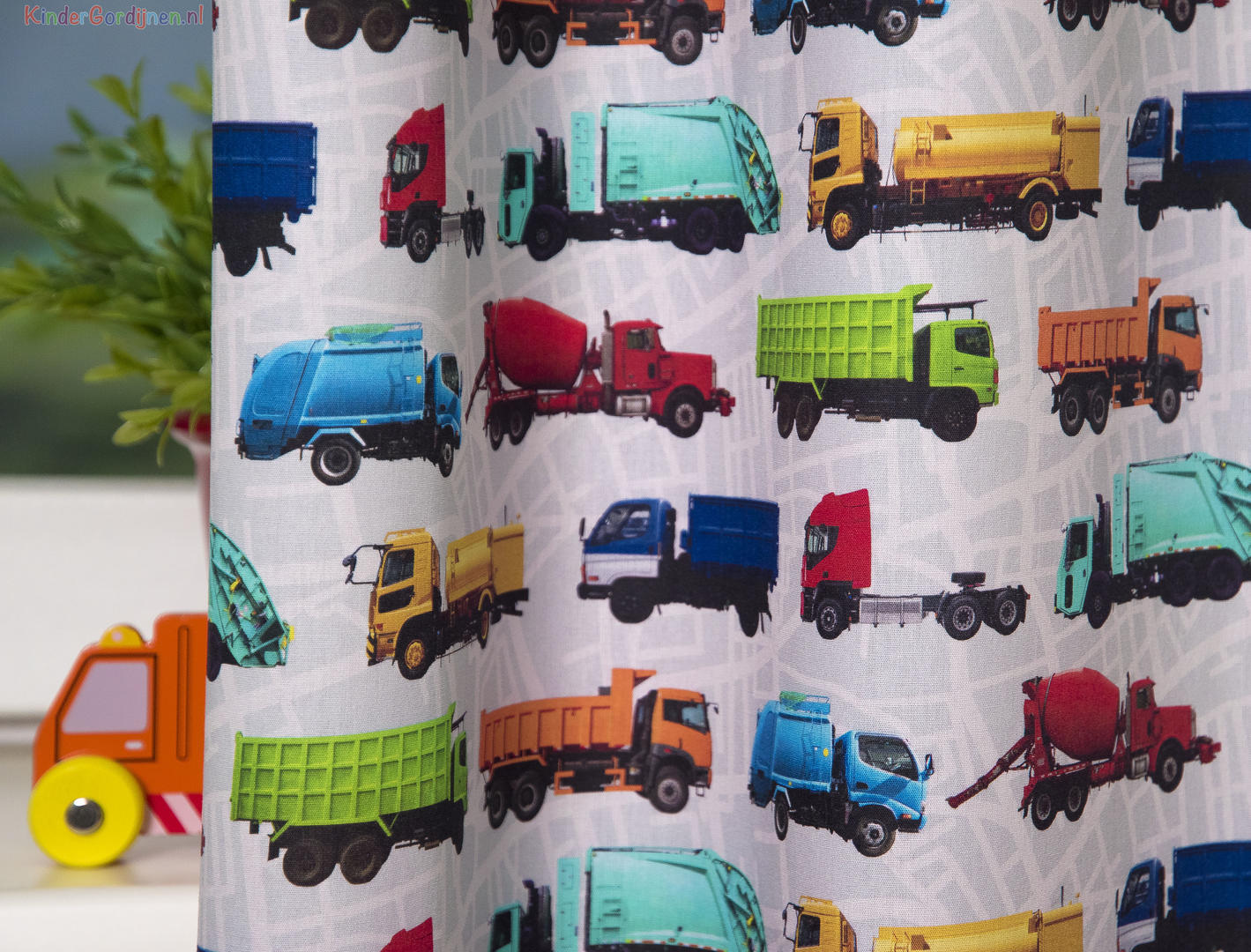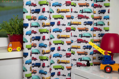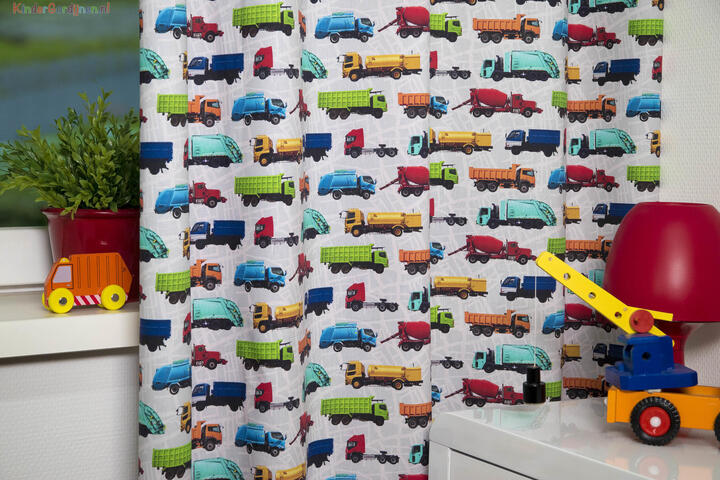 Dat geldt zeker ook voor deze gordijnstof met de naam Truck Traffic, een unieke gordijnstof met een transport dessin.