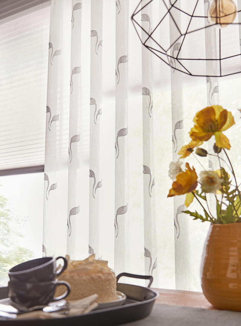 Mooie en unieke transparante vitrages en inbetweens perfect geconfectioneerd, dat is wat we belangrijk vinden. Dat geldt zeker ook voor deze inbetween Mellum. De stof is kamerhoog en voorzien van een loodveter waardoor deze inbetween altijd mooi in de plooi valt. De Mellum komt het mooist tot z’n recht met een vlinder of tri-plooi.