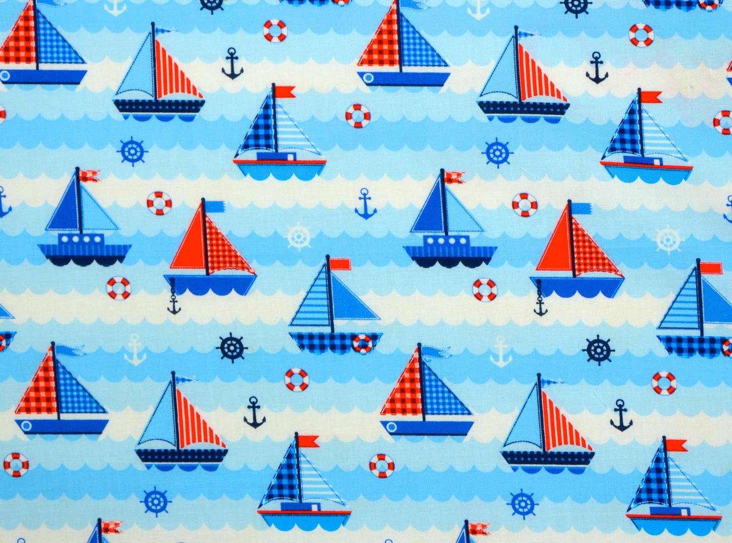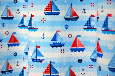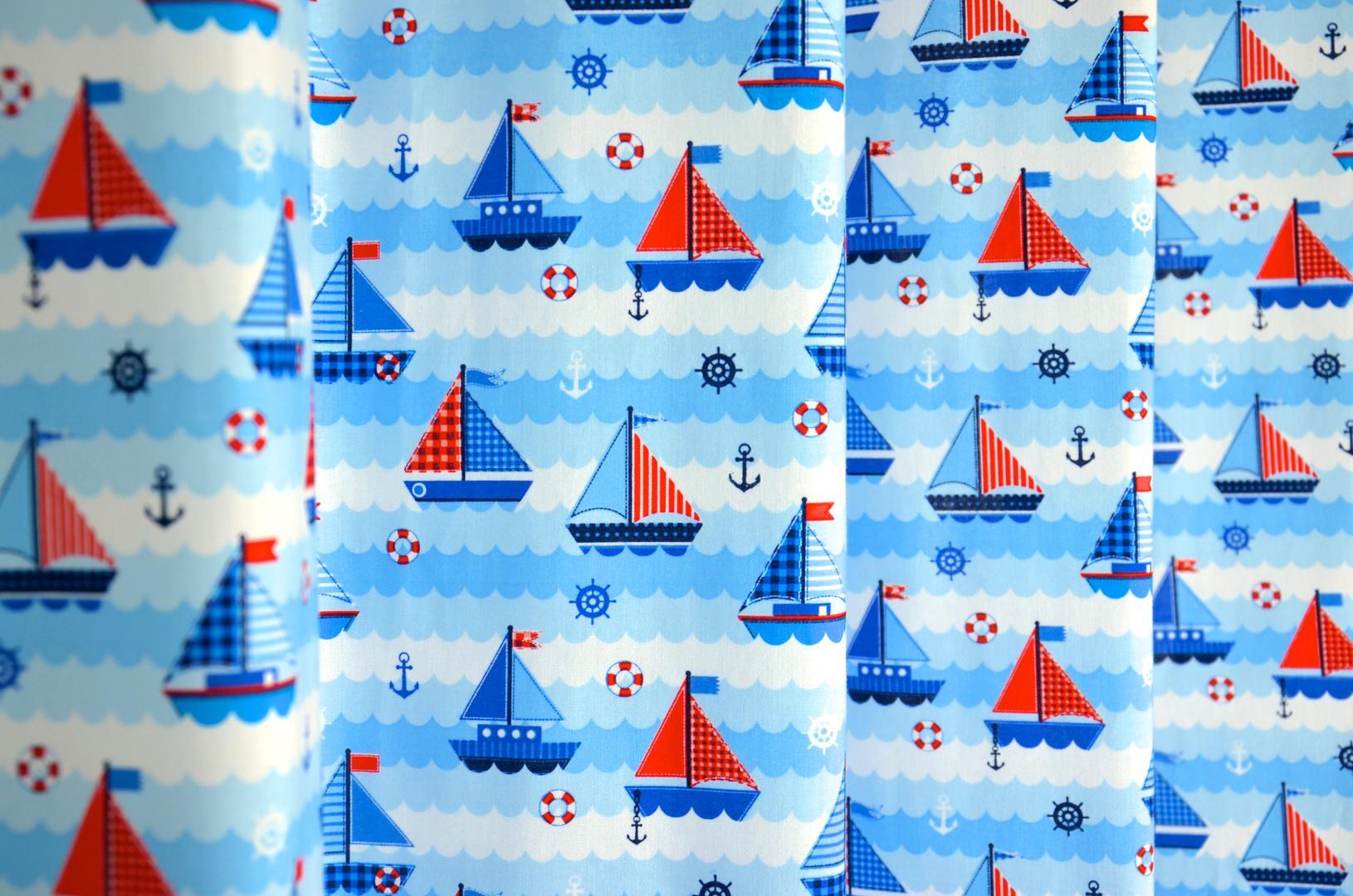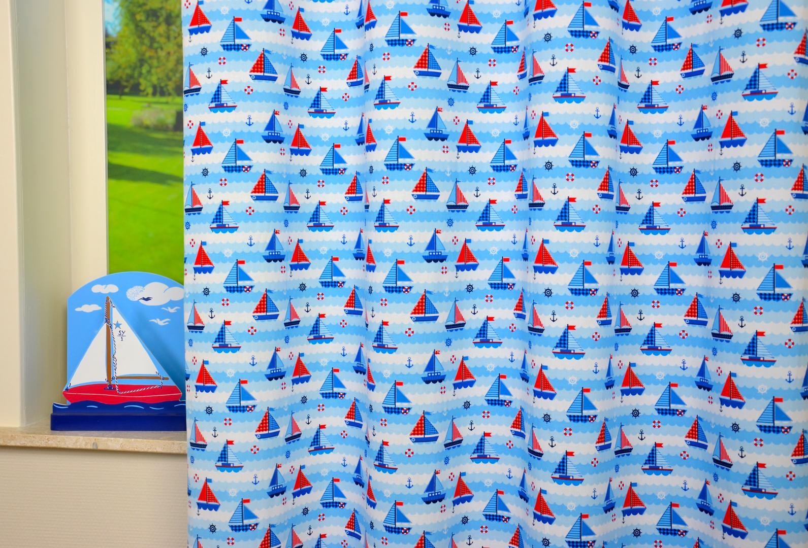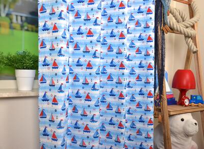 Schip AHOY! Wat een leuke zeilbootjes op zee. De 5 cm grote bootjes zijn gedrukt op lichtdoorlatende stof in verschillende blauwtinten. Rood is hierbij de accentkleur. Deze accentkleur kun je uitstekend terug laten komen in rest van de kinderkamer. Of een bijpassend kussen van dit thema meebestellen. Voor verduistering even laten voeren.