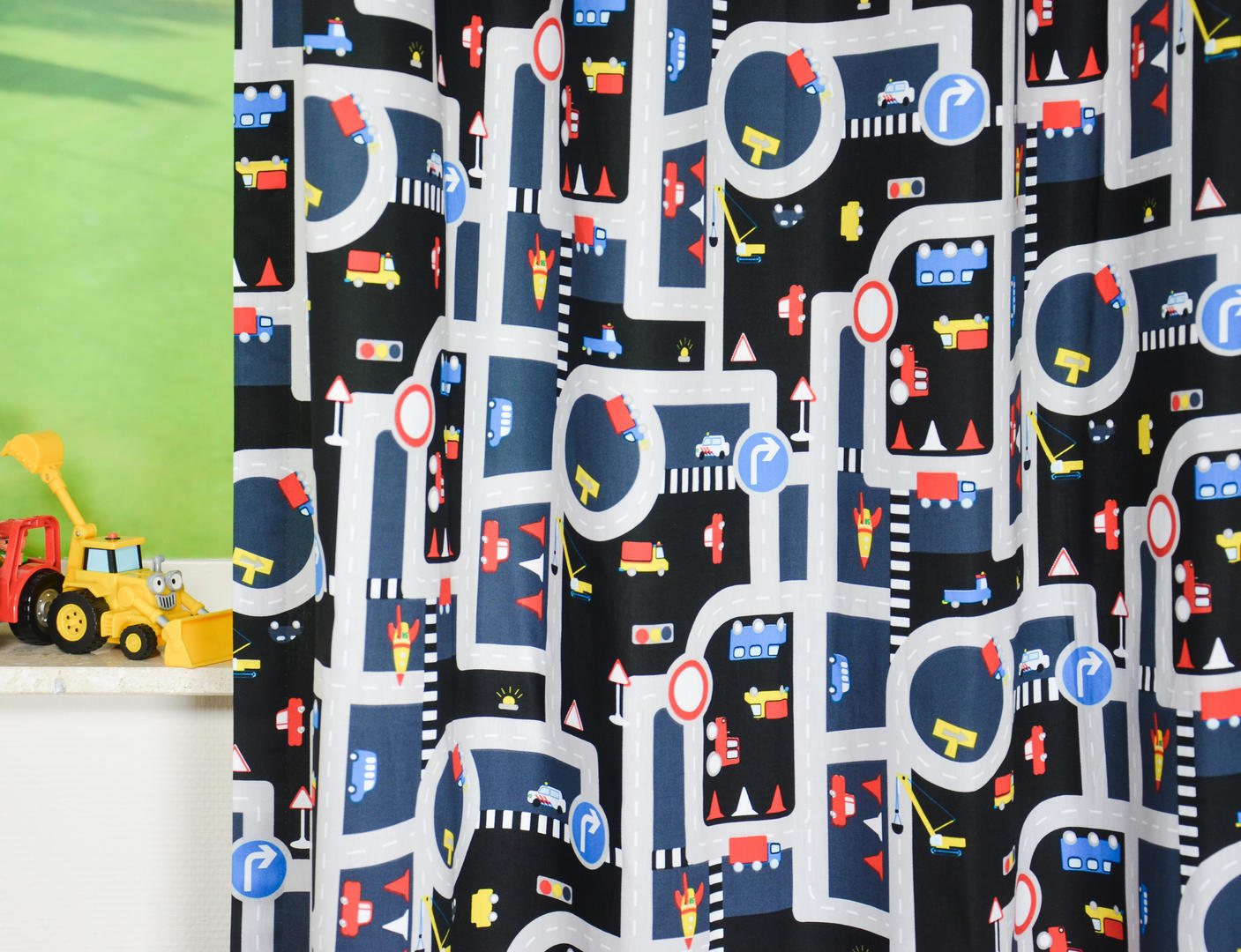 Stad, straat, verkeer, neem de rotonde nog een keer. Dat is een leuk jongensgordijn! Vanuit je bed kan je fantaseren over de route die je gaat nemen. Deze print is gedrukt op matte, super fijn geweven stof. Het lijkt haast een landkaart, zo mooi glad. Het gordijn heeft diep zwarte & antraciet tinten, samen met de contrastkleuren primair rood en fris geel geeft dat een speels effect. Dit gordijn kan daarom een witte slaapkamer énorm ophalen. Het gordijn is speels & decoratief, wanneer je graag wil dat het de slaapkamer ook verduisterd, graag optie voeren aanvinken in het bestelproces. Ga jij voor de snelste weg of rijd je lekker de toeristische route naar dromenland?