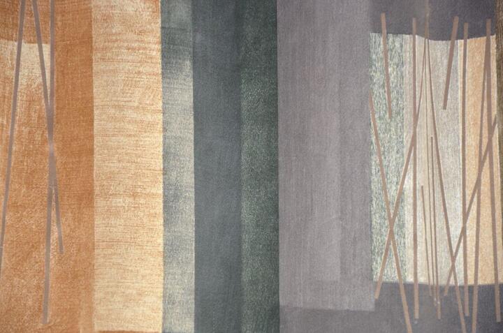 Verduisterende gladde gordijnstof met een fijn metallic accent in het dessin. De achterzijde bevat een eenvoudig veegpatroon in dezelfde kleur als de voorzijde.