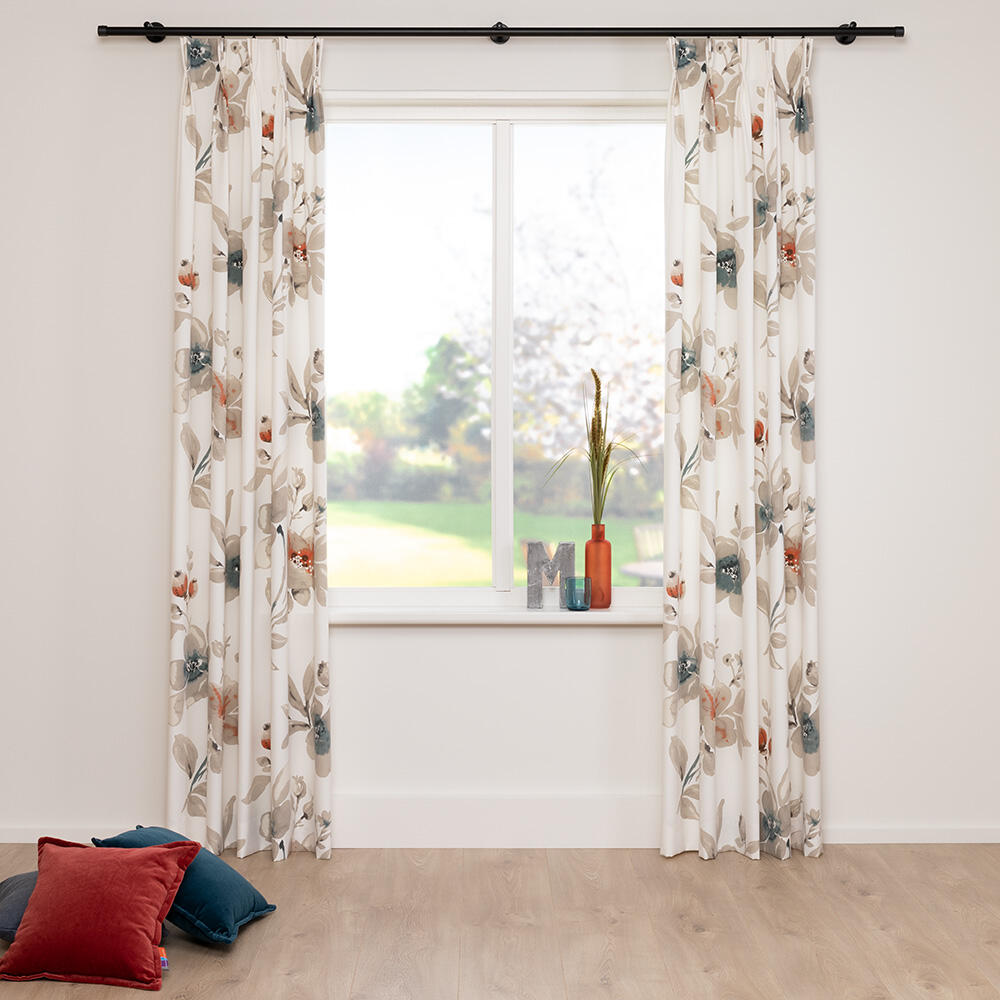 Soepel vallende bedrukte gordijnstof met een kleurig aquarel bloemdessin aan de voorzijde. De print is aan de achterzijde licht zichtbaar.