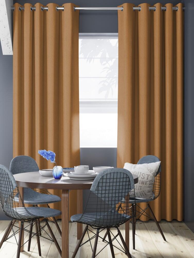 Vlamwerende en half verduisterende volumineus vallende gordijnstof met natuurlijk ogende structuur. De achterzijde van het gordijn is glad geweven.