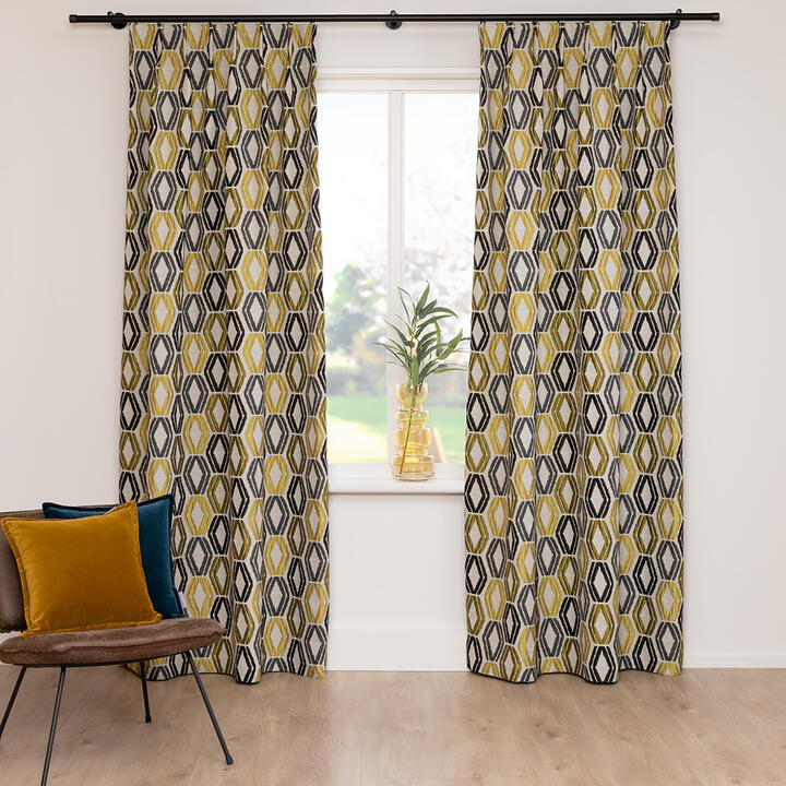 Gordijn met een prachtig groot tweekleurig ingeweven grafisch dessin. Omdat het dubbel geweven is heeft de stof een 3D reliëf. Toepasbaar als nonchalant, royaal hangend gordijn.