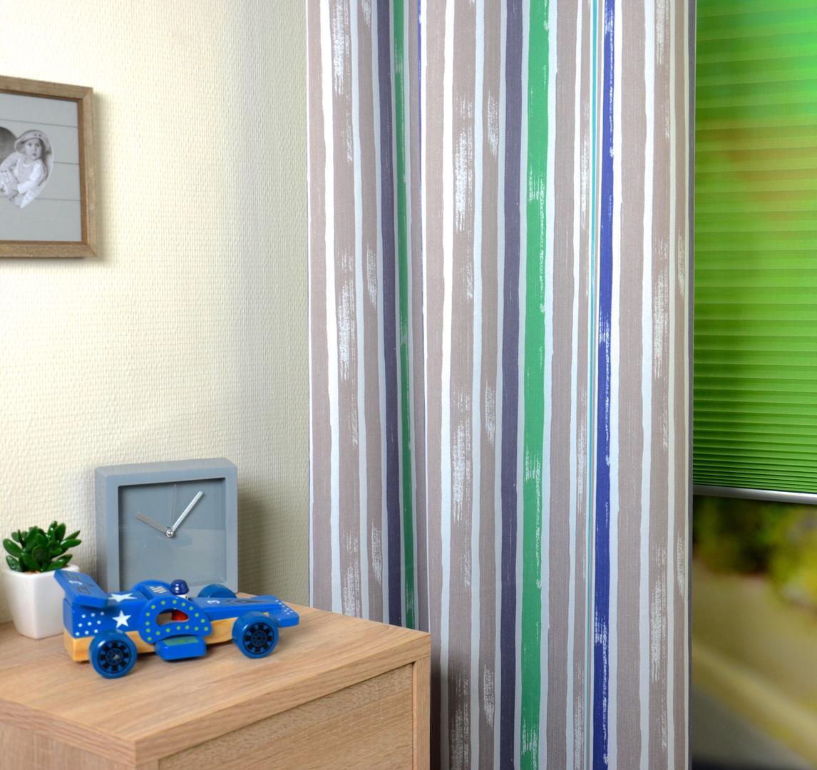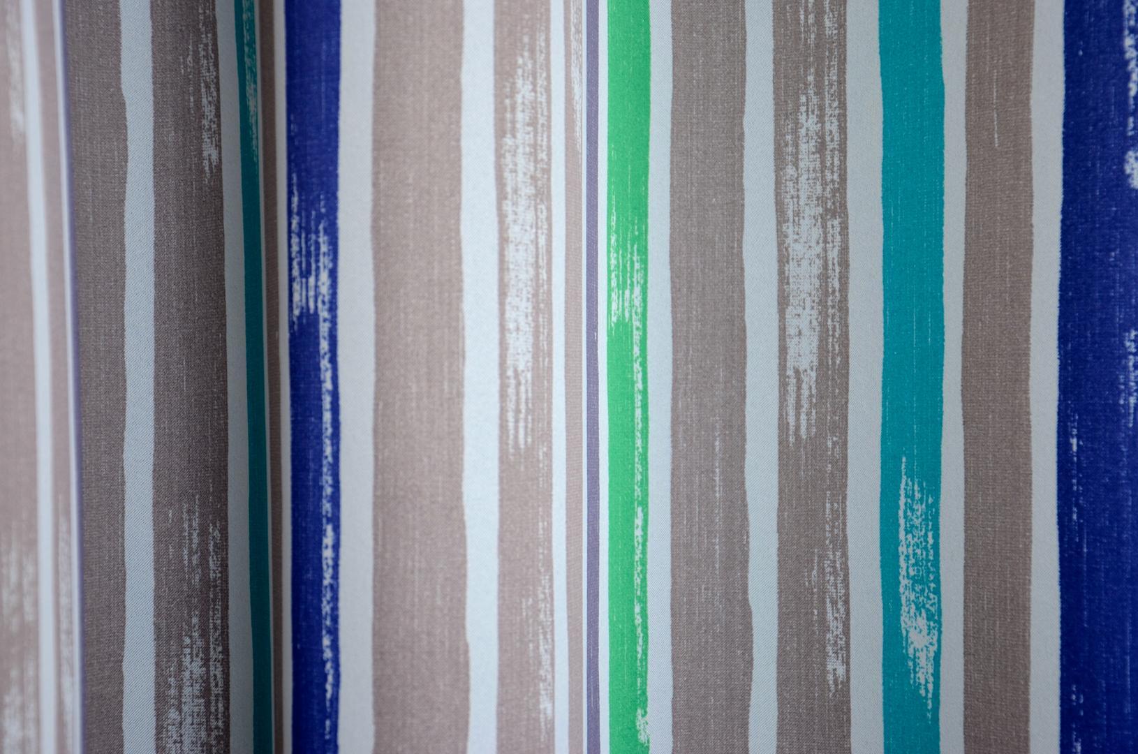 Dit is een hele bijzondere stof! De gordijnstof heeft n.l. twee mooie kanten en JIJ MAG KIEZEN! Welke zijde komt in de slaapkamer? De grote afbeelding laat de ‘Short Strokes ‘ binnen zien. Dat zijn kleurstrepen van 7 cm hoog. De achterzijde is dan gestreept. Wil je die strepen juist binnen (long strokes) dan wordt de stof precies andersom gemaakt. Even de gewenste voorzijde aanklikken. De ondergrondkleur is warm grijs en de stof heeft een behoorlijk donkermakend effect!