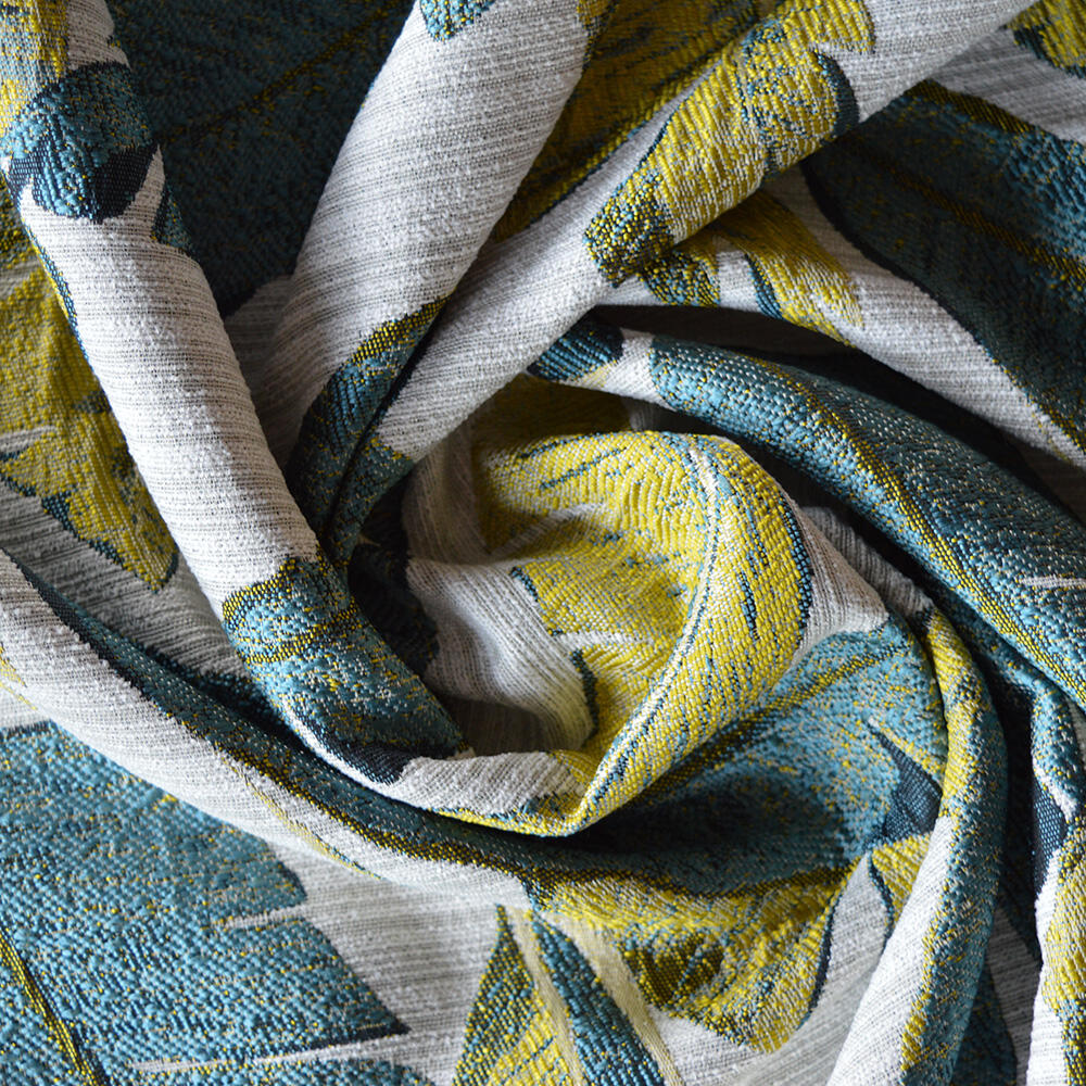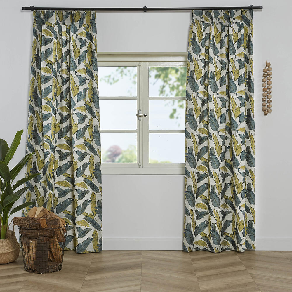 Gordijn met een grafisch geweven jacquard dessin van palm bladeren in verdikte melange garens. Toepasbaar als nonchalant, royaal hangend gordijn.