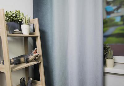 Zeer soepel vallende linnen look kindergordijn met een kleurverloop over de breedte van de stof. Aan de achterzijde van de stof is het dessin licht zichtbaar.