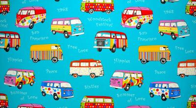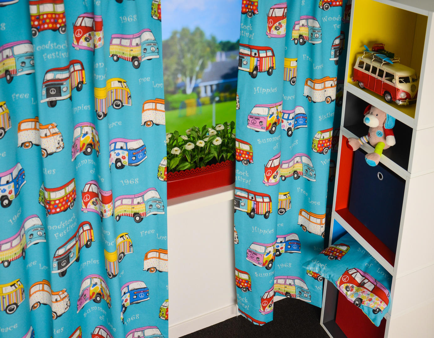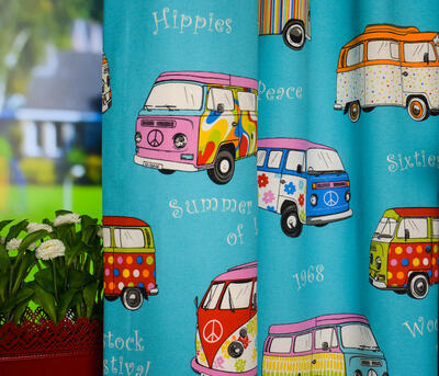Ohhh…. zo héérlijk VINTAGE, deze Volkswagen bus! Een stijlicoon geworden, wat ooit begon als ‘delivery van’. De charme van deze Volkswagen bus weten we nu extra te waarderen, want dit model uit 1968 is voor menigeen een droom! Een gordijn om blij van te worden. De Volkswagen camperbus is hier 12 cm hoog en gedrukt op iets geribde, matte stof. De ondergrond is fris aqua blauw en er zijn zomerse kleuren gebruikt voor het patroon. Stap in en ga vrolijke avonturen tegemoet vanuit jouw slaapkamer! Voor verduistering alleen nog even laten voeren of gebruik maken van onze verduisterende rolgordijnen collectie.