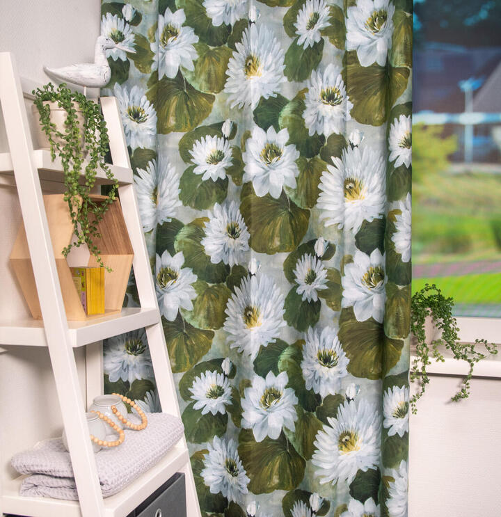 Dat geldt zeker ook voor deze gordijnstof met de naam Waterlelie, een unieke gordijnstof met een bloem en bladmotieven dessin.