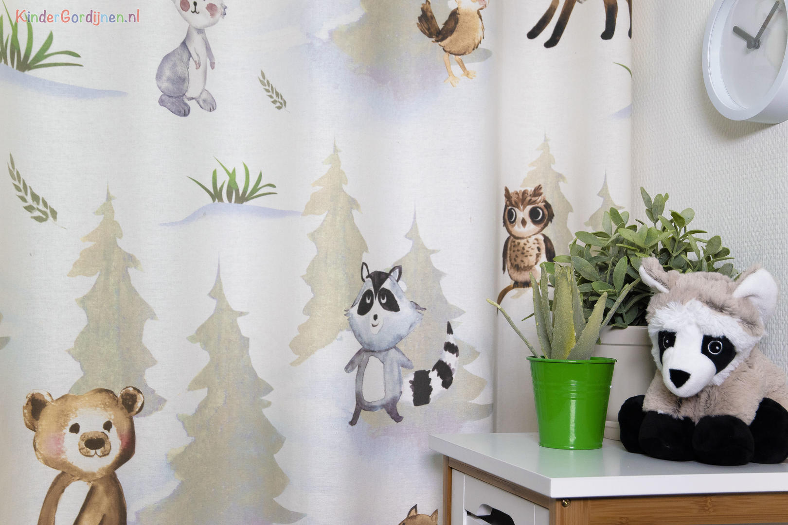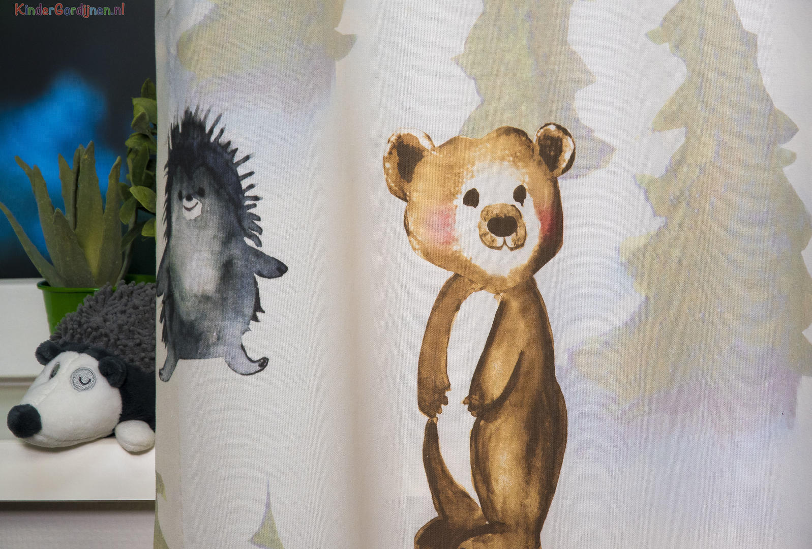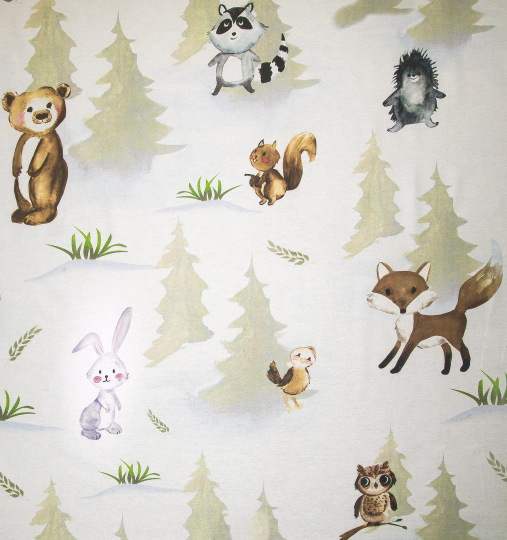 Een kindergordijn om te koesteren, wat een pláátje! De bosdieren lijken door de realistische aquareltechniek, haast handmatig op het gordijn aangebracht. Een verfijnde penseeltechniek met een zacht kleurgebruik. De dieren kijken je vrolijk en guitig aan en hebben zin in het leven, dat straalt er vanaf! Het patroon is royaal, waardoor je dit gordijn ook prima tot de grond kunt laten maken. De mus is 13 cm groot en het konijn 25 cm. De print is aan de voorzijde gedrukt op matte, fijn geweven stof. Voor extra verduistering kun je optie voeren aanvinken in het bestelproces. Wat een plezier om de kinderkamer binnen te komen met dit gordijn!