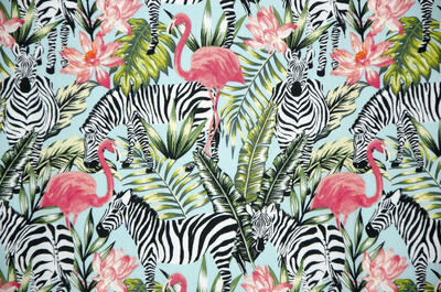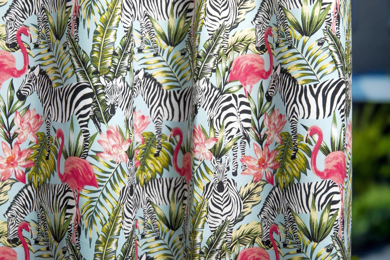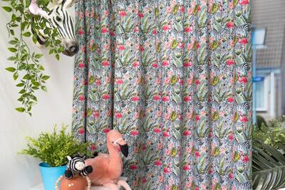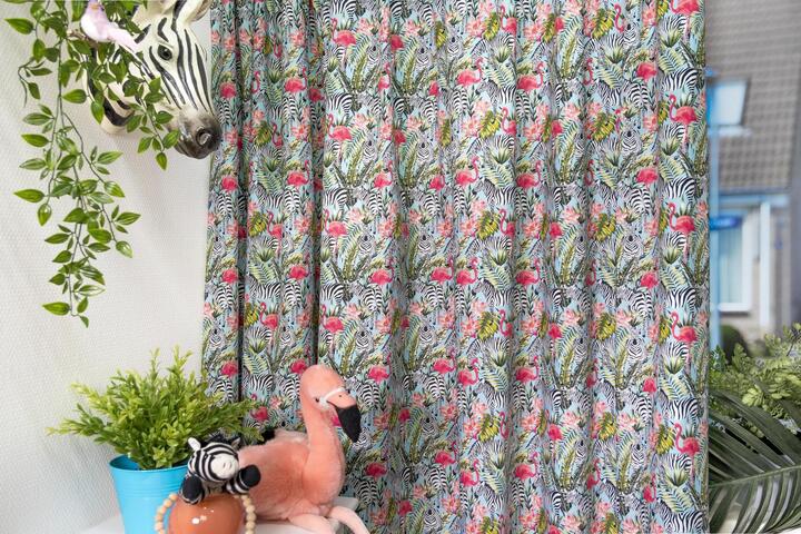 Wil je gordijnen met een flamingo op jouw slaapkamer? Deze leuke kindergordijnen zijn voorzien van een mooie tropische print in vrolijke en opvallende kleuren. Er staan niet alleen flamingo’s op, maar ook prachtige bloemen, palmbladeren en zebra’s. De combinatie van alle details levert een vrolijk geheel op met kleuren. Hierdoor passen de gordijnen in vrijwel elke kinderkamer. De volgende kleuren komen erin terug: Roze, groen, blauw, zwart en wit. De gordijnen zijn daardoor geschikt voor jongens- en meisjeskamers!
